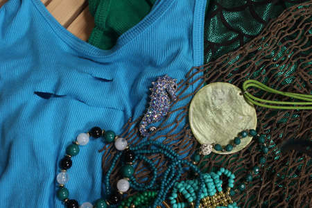 Background with fashionable clothes. Green trendy shirt, chain around the neck and silk scarf on a bright colored background. Beauty and style blog concept.