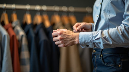 A flat lay of a men's casual outfit including jeans, sweaters, a denim shirt, and white sneakers on a light wooden floor. A hand reaches in to adjust the collar of the blue shirt, finalizing the style arrangement.