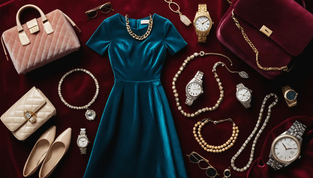 High angle view of woman's clothing and accessories on red velvet background ai generated.“This image was created using generative artificial intelligence tools