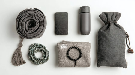 A stylish arrangement of gray accessories showcasing minimalism, including a scarf, water bottle, wallet, and beaded jewelry, perfect for everyday use or as thoughtful gifts.