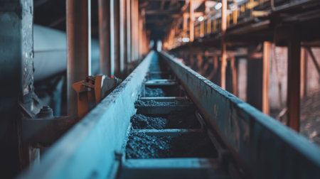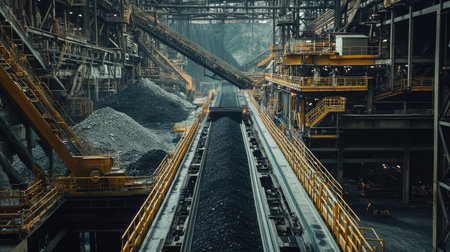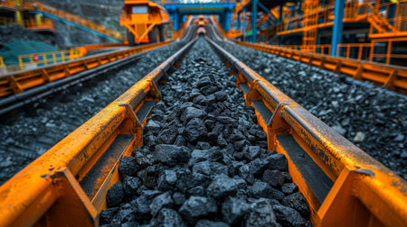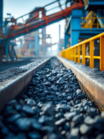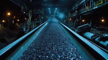 A conveyor belt in a coal mining facility, with chunks of coal being transported for further processing, highlighting the raw industrial environment.