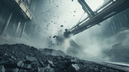 A striking industrial scene showcasing a powerful machine in action at a construction site, sending debris and dust into the air amidst a gritty atmosphere.