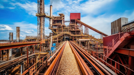 A view of a large industrial facility featuring a conveyor belt transporting materials. The image captures the complexity of manufacturing processes under a vibrant sky.