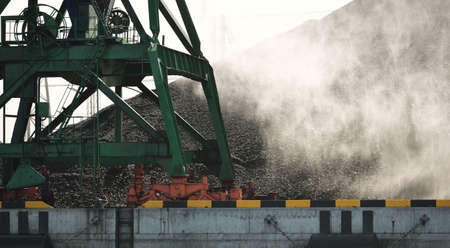 Modern coal terminal in Riga, Latvia. Cranes close-up. Baltic sea. Freight transportation, logistics, global communications, economy, business, industry, supply, special equipment. Urban landscape