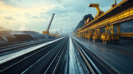 A serene industrial scene featuring extensive railway lines, heavy machinery, and mining operations under a dramatic sunset sky. The image captures the blend of nature and industrial development.
