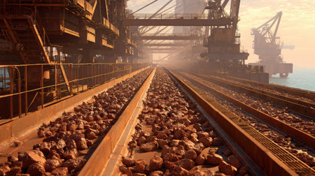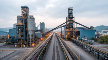 A captivating industrial scene featuring tall machinery and conveyor belts, set against a moody mountainous backdrop at dusk. The image captures the essence of heavy industry and technological advancement.