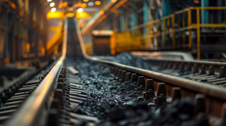 View of Coal Being Transported on Railway Tracks in an Underground Mine During Late Evening Hours With Industrial Equipment in the Background. Generative AI