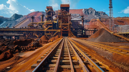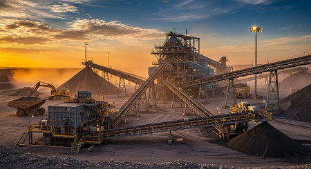A captivating view of an industrial mining operation showcasing heavy machinery, conveyor systems, and stockpiles of minerals in a rugged landscape.