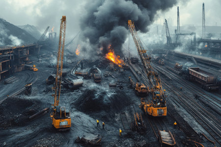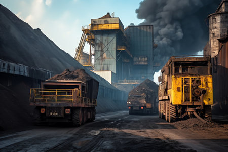 Coal mining industrial landscape. Heavy pollution, smoke, dust, ruined ecosystem. Generative AI.