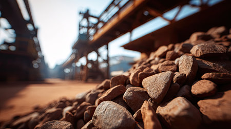 This image features a close-up view of a pile of rocks in an outdoor industrial setting, showcasing machinery and equipment in the background under a blue sky.