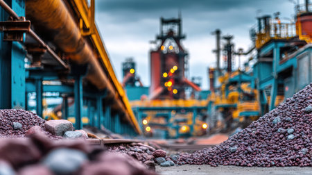 A captivating industrial landscape showcasing a mining site, featuring heavy machinery, raw materials, and a dramatic sky, reflecting the energy of production.