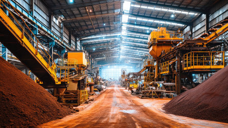 This image showcases the interior of a large industrial warehouse, featuring machinery, storage piles of raw materials, and an active work environment.
