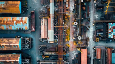 A large industrial area with many buildings and trucks. Scene is industrial and busy, with lots of activity and movement. The buildings are tall and made of metal, giving the area a modern