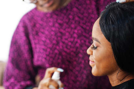 African American woman applying make-up by make-up artist at beauty saloon. Artist make photo on mobile phone of her work.