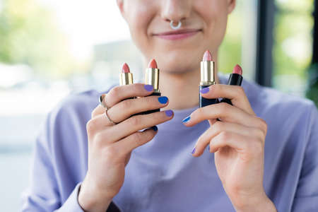 Face portraits with diverse women of different ethnicities holding lipsticks.