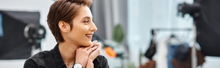 joyous young professional female photographer in casual attire smiling and looking away, banner