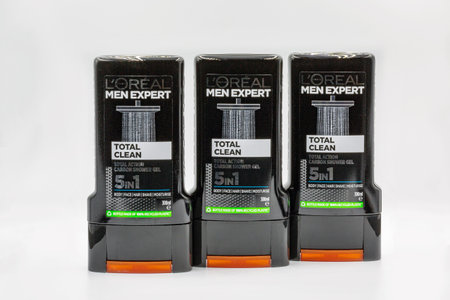 KYIV, UKRAINE - NOVEMBER 16, 2020: L'Oreal Paris Men Expert 5 in 1 shampoo and shower gel closeup. It is a French company headquartered in Clichy, Hauts-de-Seine, world's largest cosmetics producer.