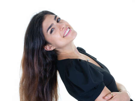 long hairs young pretty fashion woman beautiful cute girl brunette profile posing in studio wall white background