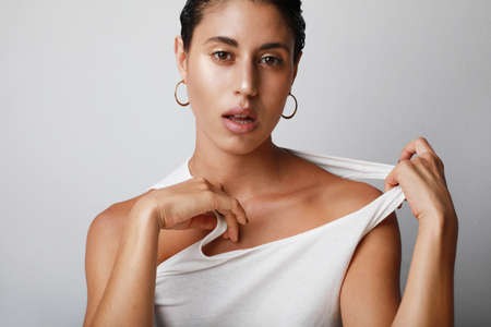 Hands of woman undressing white bra. Hands of woman undressing brassiere. Close-up nude photo