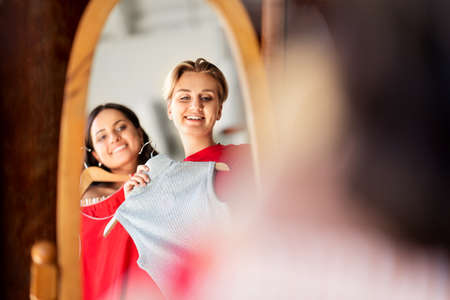 cheerful woman trying on clothes wardrobe Youth style light background unaltered