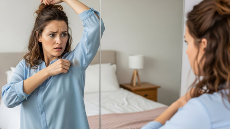 Concerned young caucasian female examining stain on sleeve in mirror.