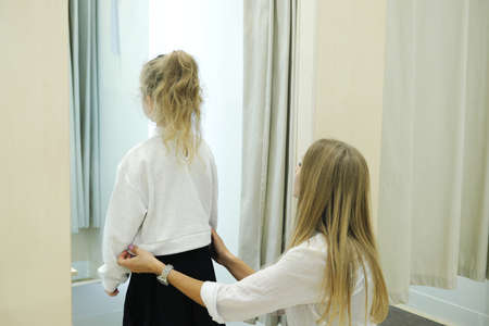 Mother and her little daughter in a fitting room in a shopping mall. Girl trying on a jacket and skirt before buying. Horizontal photo