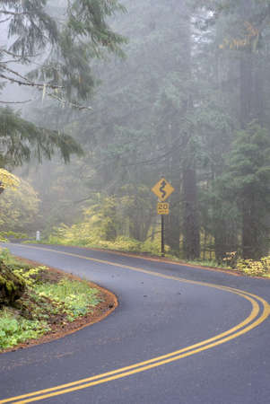 Windy forest road with a curve sign on a foggy day.