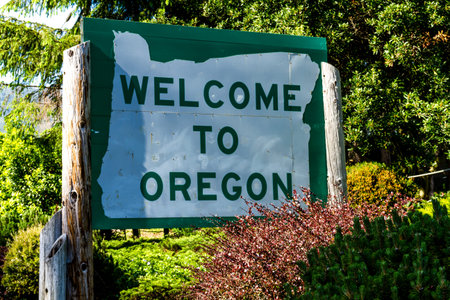 Welcome to Oregon state sign on highway upon entering state border of Oregon