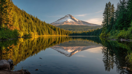 Serene beautiful lake in morning mountains, Oregon, USA.