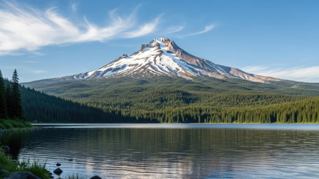 The volcano mountain Mt. Hood, Oregon, USA. Trillium lake. Summer season in mountains