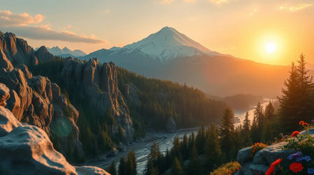 Beautiful sunset at Eliot River Branch leading towards Mount Hood in Oregon