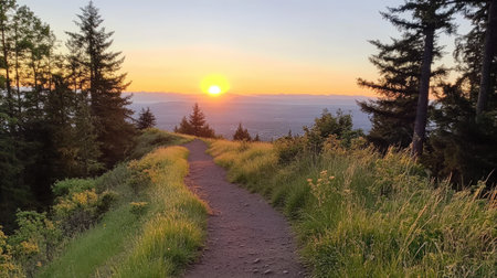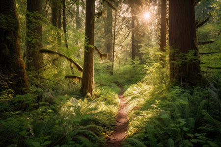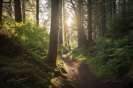 A mystical trail leads through a dense forest, illuminated by soft morning light and surrounded by greenery.
