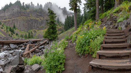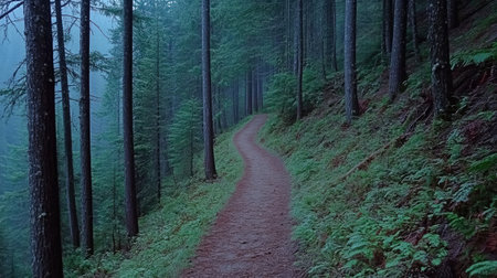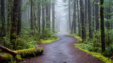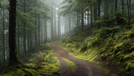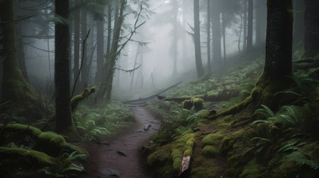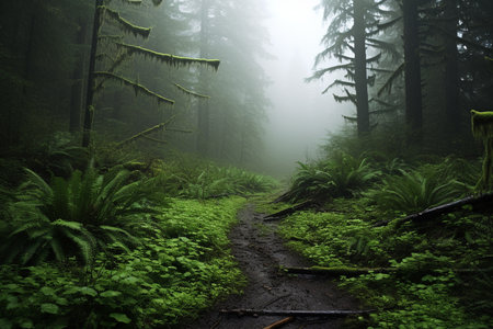 Hiking trail in a foggy forest with trees and ferns
