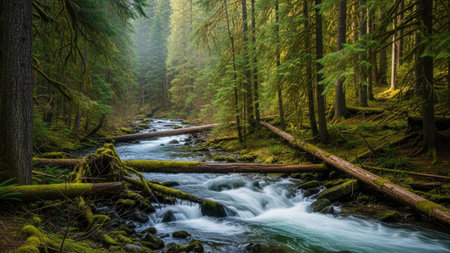 Mossy rocks and river in a green forest, California, USA