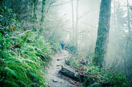 Adventurous girl hiking on a trail in the woods during a foggy and rainy day. Taken in Cypress Provincial Park, Vancouver, British Columbia, Canada.