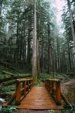 Juan de Fuca Trail in the woods during a misty and rainy summer day. Taken near Port Renfrew, Vancouver Island, BC, Canada.