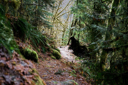 Mystical View of the Trail in Rain Forest during a foggy and rainy Winter Season. Woods in Squamish, North of Vancouver, British Columbia, Canada.