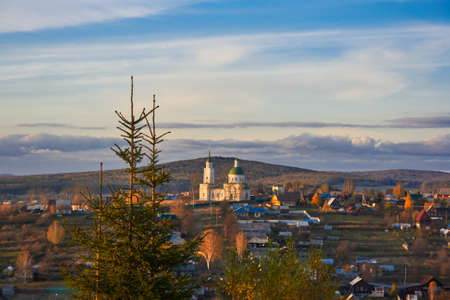 View of the village of Chernoistochinsk Sverdlovsk region from the top of the mountain at sunset in autumn