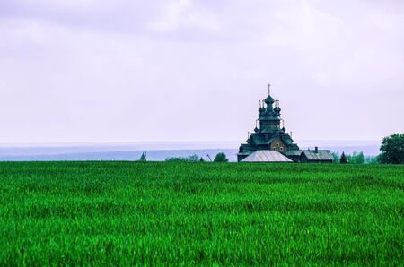 Russian rural landscape with river and orthodox church during rainy day