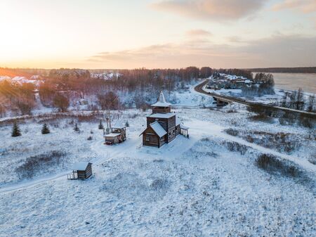 Tyumen, Russia - November 05.2016: Winter landscape with church of the Ascension and the wooden house