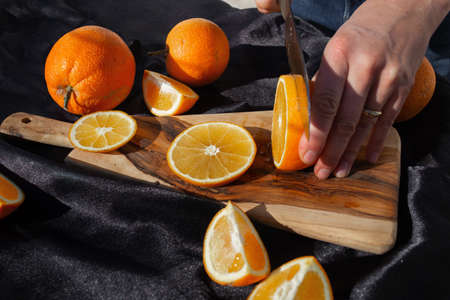 photo of the orange slicing process. A woman cuts an orange into circles with a knife on a wooden board