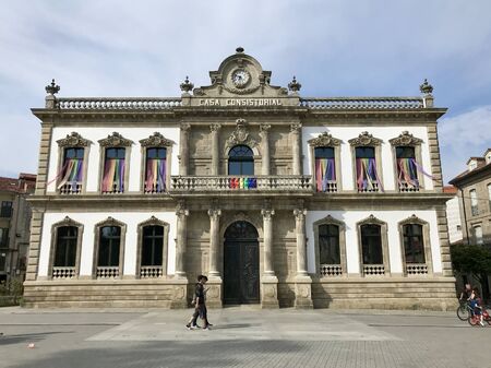 Pontevedra, Pontevedra / Spain - July 6 2018: Front view of the Casa Consistorial (town hall) of the city of Pontevedra in Galicia during a sunny day of summer