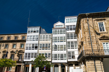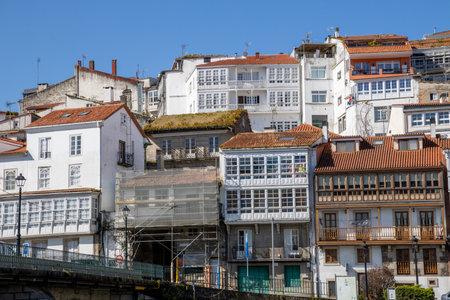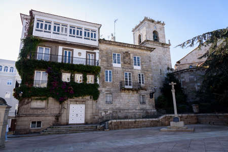 Betanzos, Spain - Jun 21, 2023: Street of the historical center of the beautiful village of Betanzos with the typical facades, A Coruna, Galicia, Spain.