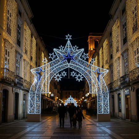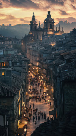 As twilight falls over Santiago de Compostela, the Cathedral shines brightly, surrounded by bustling plazas filled with people enjoying the evening atmosphere.