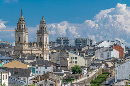 LUGO, SPAIN - AUGUST 26, 2022: View of the old town of Lugo, from the Roman walls, Galicia, northwestern Spain