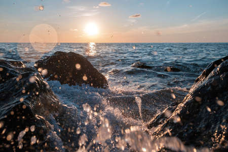 A beautiful and tranquil seascape during sunset. The warm light of the setting sun reflects on the gentle ocean waves as they splash against the dark rocks in the foreground.