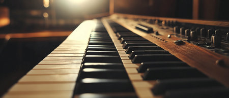 This close-up shows a vintage synthesizer keyboard with black and white keys and various controls. The attention to detail highlights its musical potential and retro design