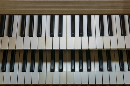 Close up old vintage manual double keyboard (bank of keys) of church organ, high angle view