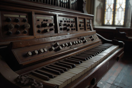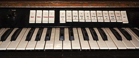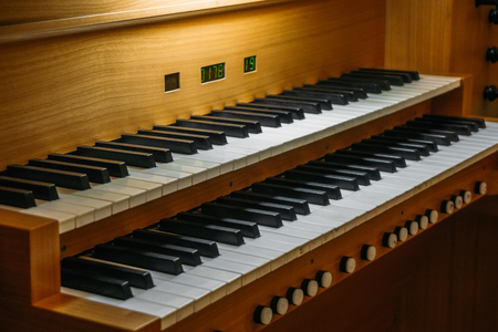 Keyboard of a traditional catholic church piano for playing religious melodies