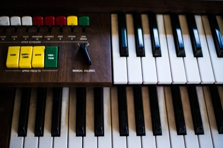Desaturated close up shot of an organ keyboard